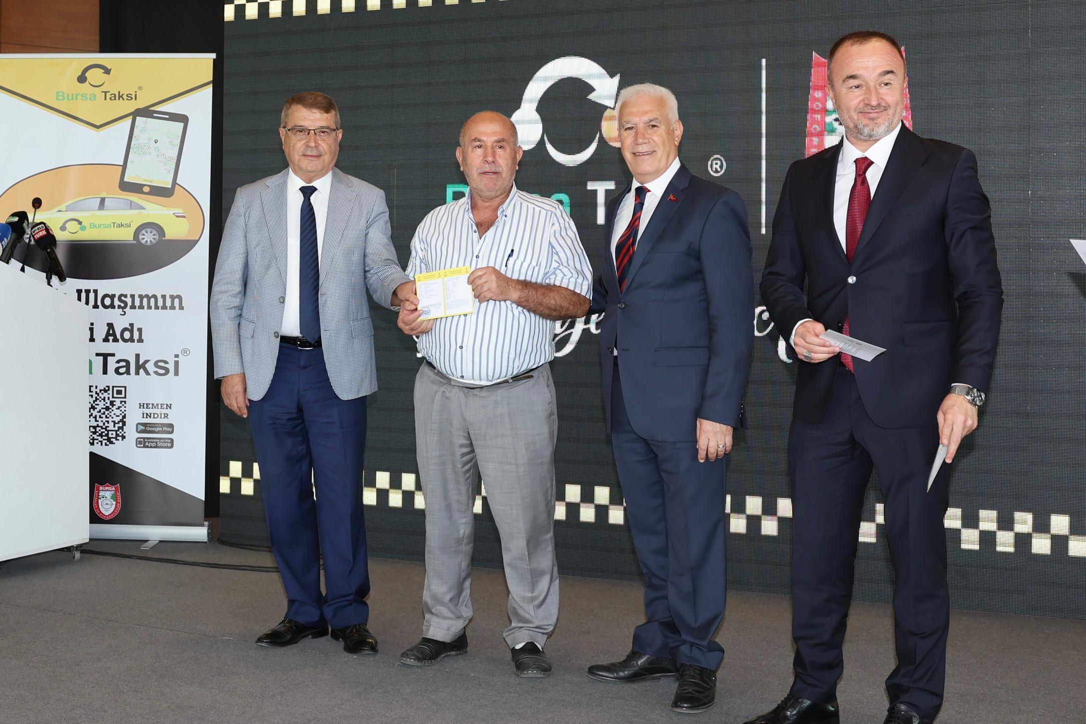 Konuşmaların ardından Fahrettin Bilgit ve Ahmet Çakır tarafından Başkan Mustafa Bozbey’e günün anısına taksi maketi verildi. Daha sonra 18 taksi esnafına ruhsatlarını teslim eden Başkan Mustafa Bozbey, ‘Bursa Taksi’ uygulamasını kullanarak ilk taksiyi çağırdı. Araca ‘Bursa Taksi’ logosunu yapıştıran Başkan Bozbey, taksiye binerek yolculuk yaptı.