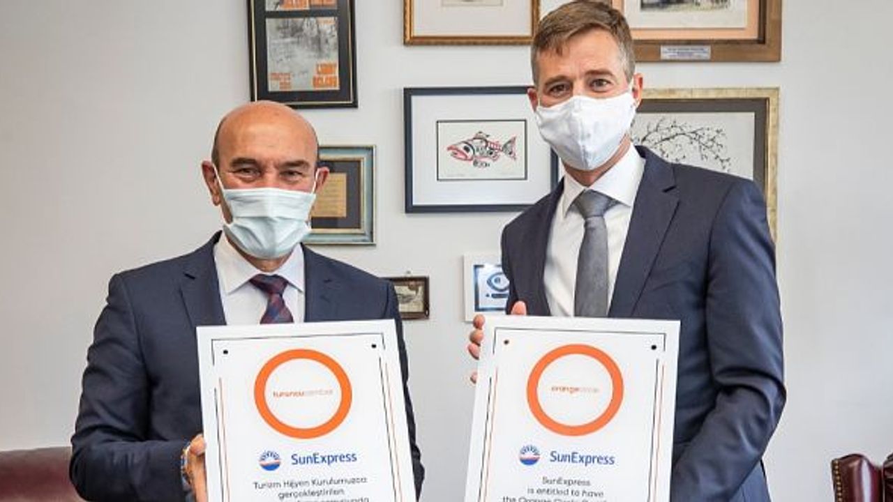 İzmir Büyükşehir Belediyesi, geçtiğimiz haftalarda gerekli kriterleri yerine getiren yeme-içme ve konaklama işletmelerine verdiği Turuncu Çember sertifika programının kapsamını genişletmiş ve havayolu firmalarının da sertifika alabilmesine olanak tanımıştı. Uluslararası standartlarda havacılık hizmetlerini sürdüren Türkiye’nin önde gelen havayolu firmalarından SunExpress, Turuncu Çember hizmetinden yararlanmak için başvuruda bulunan ilk firma oldu. 11 ana başlık ve 65 maddeden oluşan havayolu firmaları değerlendirme kriterlerinin tamamını başarıyla tamamladığı tespit edilen SunExpress’e Turuncu Çember sertifikasını İzmir Büyükşehir Belediye Başkanı Tunç Soyer verdi.