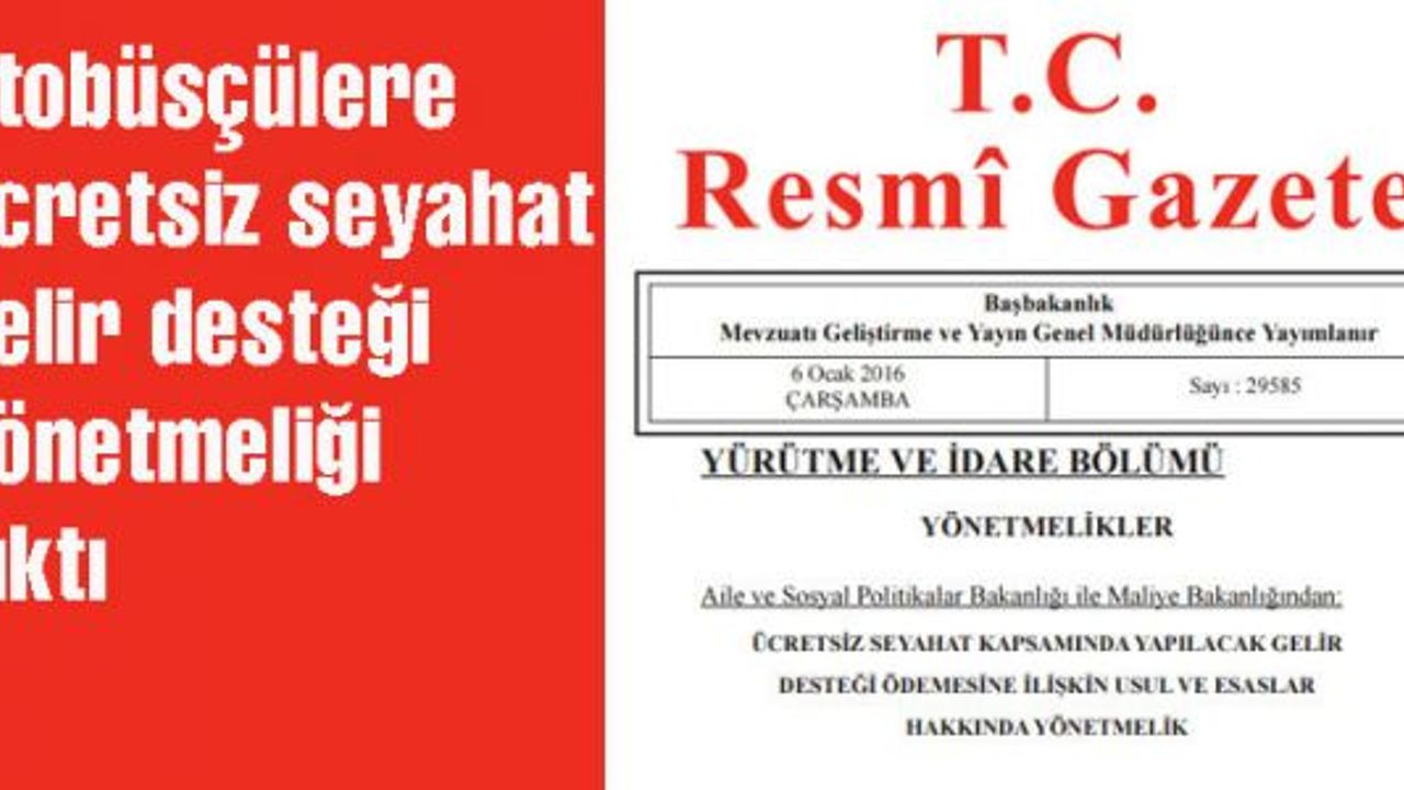 Yönetmelik 6 Ocak 2016 tarih ve 29585 sayılı Resmi Gazete’de yayınlandı. Aile ve Sosyal Politikalar Bakanlığı ve Maliye Bakanlığı Ücretsiz Seyahat Kapsamında Yapılacak Gelir Desteği Ödemesine İlişkin Usul ve Esaslar Hakkındaki Yönetmeliği yayınladı. Yönetmelik ile belediyeler tarafından yetki verilen özel şahıs yada şirkete ait şehiriçi toplu taşıma hizmeti veren her bir ulaşım aracı ile özel deniz ulaşım aracı için bunların işletmecilerine belediyeler aracılığıyla yapılacak gelir desteği ödemesine ilişkin usul ve esasları belirlendi. Yönetmelik ile başvuru, ödeme ve denetim esasları da belirlendi. Ödemeler belediyeler aracılığıyla yapılacak. Şehir içi kara ve deniz taşımacılığında taksi, taksi dolmuş, dolmuş, rekreatif, turistik ve servis amaçlı kullanılan araçlar ücretsiz seyahat ve ödeme kapsamının dışında.