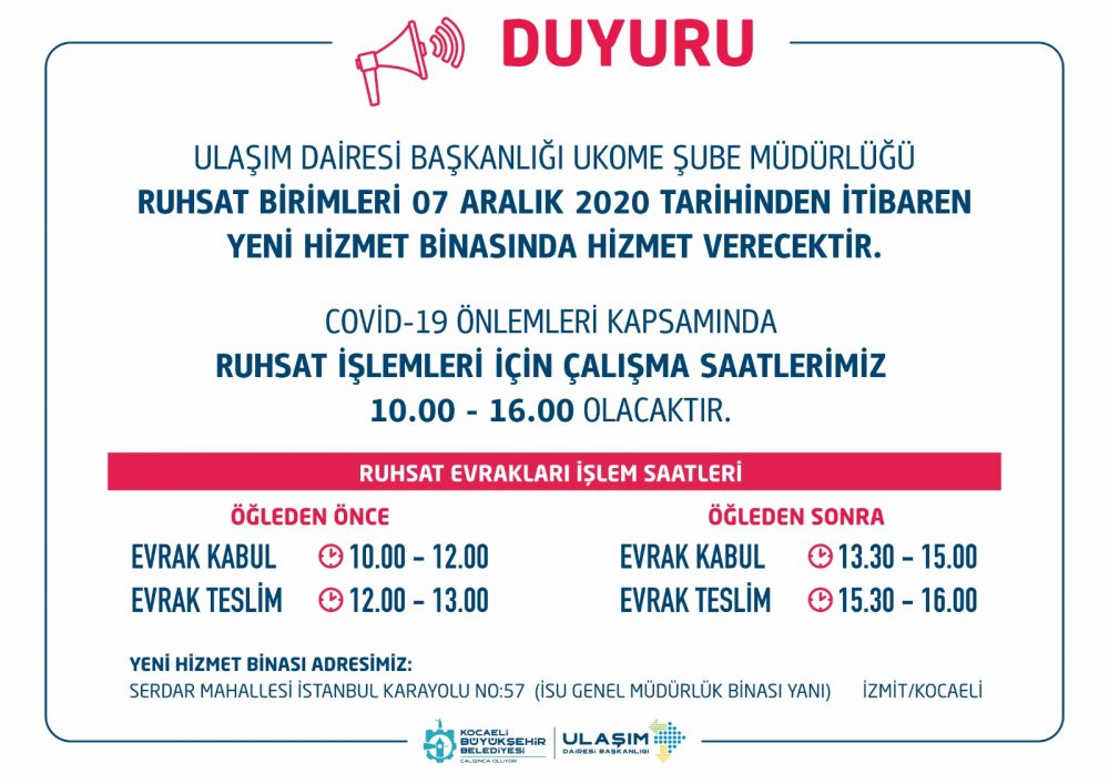 Kocaeli Büyükşehir Belediyesi Ulaşım Dairesi Başkanlığı 7 Aralık Pazartesi günü itibariyle Serdar Mahallesi D-100 Karayolu üzeri İSU Genel Müdürlüğü yanındaki yeni binasında hizmet vermeye başlayacak. Pandemi süreci nedeniyle 10.00-16.00 saatleri arasında hizmet veren Ulaşım Dairesi Başkanlığı ruhsat evrakları işlem saatlerinde de değişikliğe gitti.
