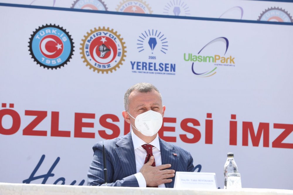 Demiryol-İş Sendikası Adapazarı Şube Başkanı Cemal Yaman, “Kocaeli Büyükşehir Belediye Başkanı Tahir Büyükakın’a sonsuz teşekkürlerimi sunuyorum” dedi. Pandeminin tüm dünyayı esir aldığını söyleyen Yaman, “Sağlıkçılardan sonra bu pandemiden en çok etkilenen gruplardan biri de ulaşım personelimizdir. Ayrıca Filistin’de kan akıtan İsrail’i şiddetle kınıyorum. Onlara barış ve huzurun gelmesini temenni ediyorum” şeklinde konuştu.