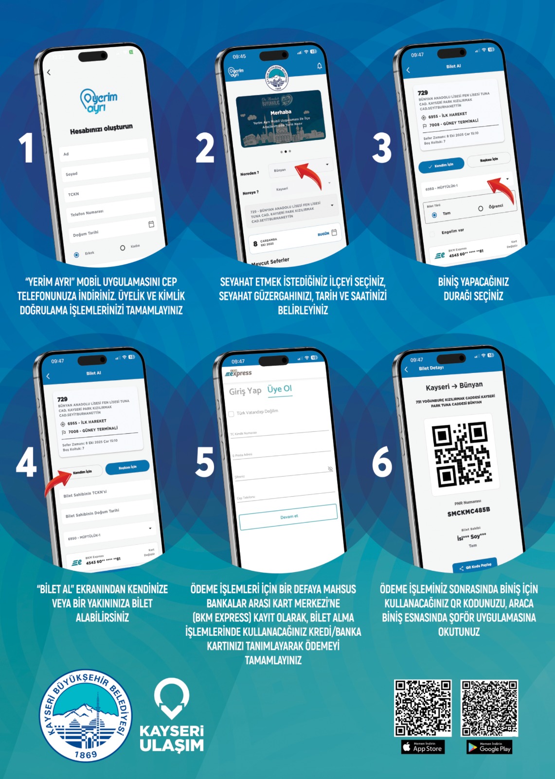 Kayseri Büyükşehir Belediyesi, ulaşımda dijitalleşme adımlarına bir yenisini daha ekleyerek vatandaşlara çağdaş ve pratik bir hizmet sunuyor. Bu kapsamda Kayseri Büyükşehir Belediyesi Ulaşım A.Ş. vatandaşların ilçe seyahatlerini daha kolay ve planlı hale getirecek önemli bir projeyi hayata geçirdi. Kırsal ilçe yolculuklarında rezervasyon ve talep odaklı ulaşımı mümkün kılacak “Yerim Ayrı” mobil uygulaması, ilk olarak Bünyan ilçesinde 13 Ekim Pazartesi günü vatandaşların kullanımına sunulacak.