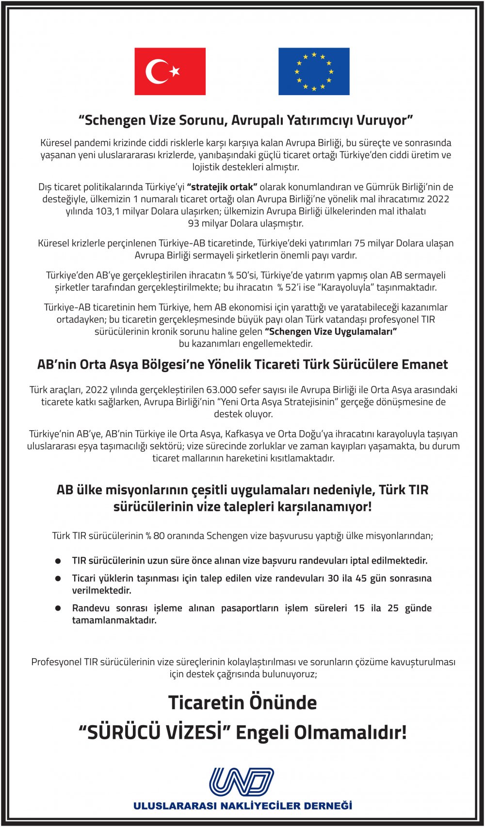 Profesyonel TIR sürücülerinin vize süreçlerinin kolaylaștırılması ve sorunların çözüme kavușturulmasıiçin destek çağrısında bulunuyoruz;