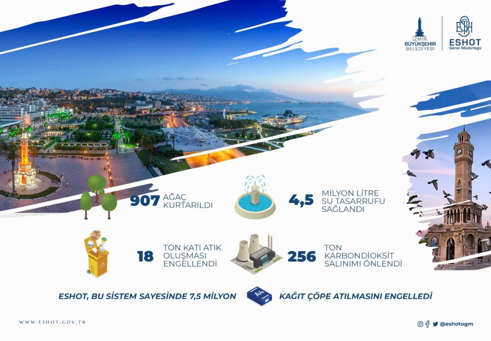 Toplam 907 ağacın kesilmesini önleyecek kadar kâğıt tasarrufu yaptığı belirlenen ESHOT’a, 5 Haziran Dünya Çevre Günü’nde, “En Yeşil Ofis” ödülü takdim edildi.ESHOT’un çevre etki değerlendirme raporunda, sistem sayesinde 4,5 milyon litre su kullanımının önüne geçildiği, 256 ton karbon emisyonu ile 18 ton katı atık oluşumunun engellendiği ve toplam 7,5 milyon adet kâğıdın çöpe atılmasının da önlendiği belirtildi.