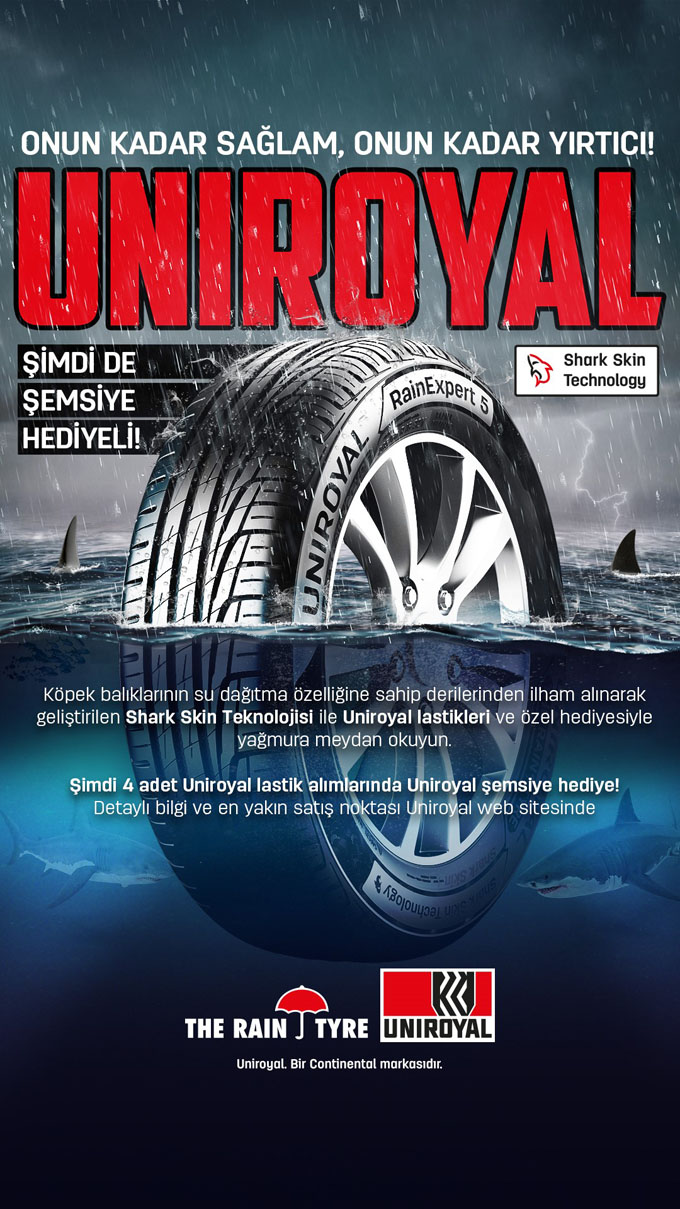 Yağmurlu havalarda ve ıslak yol koşullarında üstün performansı ve tasarımı ile öne çıkan Uniroyal lastikleri, sonbahar yağmurlarıyla birlikte sürücülerin en yakın yol arkadaşı oluyor. Yağmur lastiklerinin yaratıcısı olarak bilinen Uniroyal, geliştirdiği köpekbalığı derisi teknolojisi (Shark Skin Teknolojisi) sayesinde suyun hızla tahliye edilmesini sağlıyor. Bu sayede suda kızaklama güvenliği, düşük yuvarlanma direnci ve iyileştirilmiş yol tutuşu ile hem güvenlik hem de sürüş konforu sunuyor.