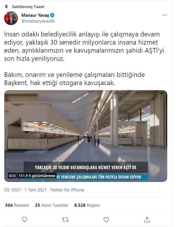 AŞTİ’de yapılan yenileme çalışmalarına ilişkin Başkentlileri sosyal medya hesapları üzerinden bilgilendiren Büyükşehir Belediye Başkanı Mansur Yavaş, “İnsan odaklı belediyecilik anlayışı ile çalışmaya devam ediyor, yaklaşık 30 senedir milyonlarca insana hizmet eden, ayrılıklarımızın ve kavuşmalarımızın şahidi AŞTİ’yi son hızla yeniliyoruz. Bakım, onarım ve yenileme çalışmaları bittiğinde Başkent, hak ettiği otogara kavuşacak” dedi.