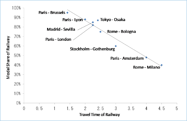 Şekil 4. Seyahat Süresi ve Yüksek Hızlı Demiryolunun Türel Payı Arasındaki İlişki