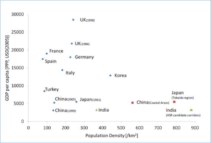 Ayrıca Hindistan; Mumbai (Bombay)-Ahmedabad, Chennai-Bangalore gibi oldukça nüfus yoğun koridorlara sahiptir. Bu bölgeler; ülke genelindeki nüfus yoğunluğunun üzerinde bir yoğunluğa sahip olup bu değer Çin ve Japonya’nın yüksek hızlı demiryolu yapımına başladığı yıllardaki nüfus yoğunluğu ile örtüşmektedir.