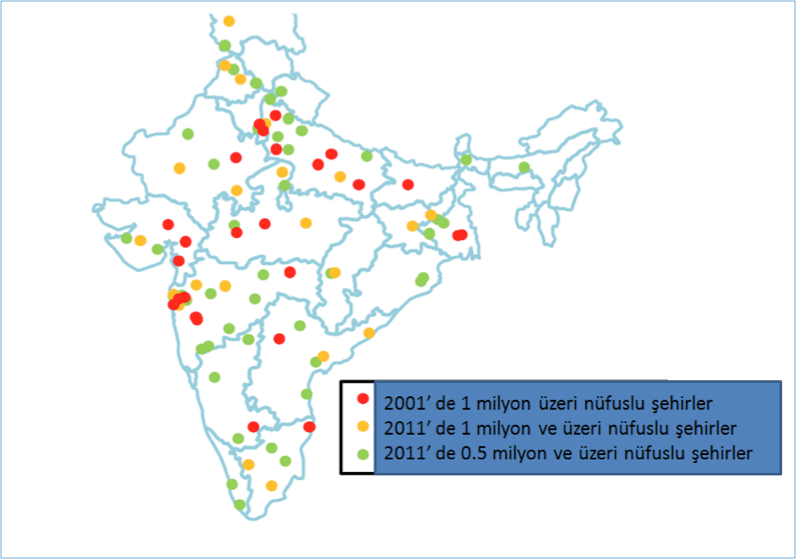 Dolayısıyla Hindistan; gerek nüfus yoğunluğu ve gerekse de Gayri Safi Milli Hâsıla olarak yüksek hızlı demiryolu yapımına birkaç yıl içerisinde girmek için yeterli koşulları sağlamaktadır. Ayrıca; Şekil 4’te de görüldüğü üzere Hindistan’ın birçok şehri 1 milyon ve üzerinde nüfuslara sahiptir. Hindistan’da milyonluk nüfusa sahip şehirlerin sayısı 2001’de 25 iken 2011’de 46’ya yükselmiştir. Bu sayı takip eden yıllarda daha da artmıştır. Dahası; Hindistan’da bazı bölgelerdeki şehirler zonlara ayrılmış olup yüksek hızlı demiryolu yapımına daha uygun hale gelmiştir.
