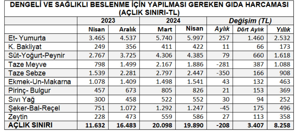 Yetişkin erkek için 2.800, kadın için 2.200, genç için 3.000 ve çocuk için de 1.600 kalori esas alınarak yapılan hesaplamaya göre Nisan ayında açlık sınırı yetişkin erkek için 5 bin 807 lira, yetişkin kadın için 4 bin 599 lira, çocuk için 3 bin 310 lira ve genç için de 6 bin 214 lira oldu.
