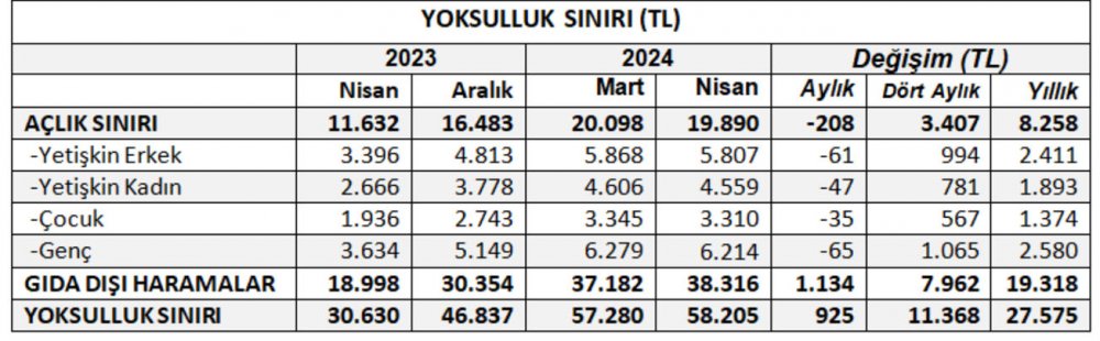 Açlık sınırı nisanda bir önceki aya göre 208 lira azalırken, gıda dışındaki ihtiyaçlar için yapılması gereken harcama ise 1.134 liralık artışla 38 bin 316 liraya çıktı. Her ikisinin toplamından oluşan yoksulluk sınırı ise önceki aya göre 925 lira arttı. Son bir yıllık dönemde ise açlık sınırı 8 bin 258 lira, gıda dışındaki ihtiyaçlar için yapılması gereken harcama 19 bin 318 lira ve yoksulluk sınırı ise 27 bin 575 liralık artış kaydetti.