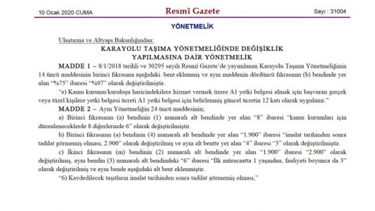 Karayolu Taşıma Yönetmeliği 10 Ocak 2020 tarihli Resmi Gazete’de yayımlandı. Yönetmelikte yapılan değişiklik ile B1, B2 ve D1 ve D2 belge ücretleri büyük miktarda arttı. Ayrıca A1 belgesinin alımına ve çalışma düzenine yönelikte yeni düzenlemeler yapıldı.
